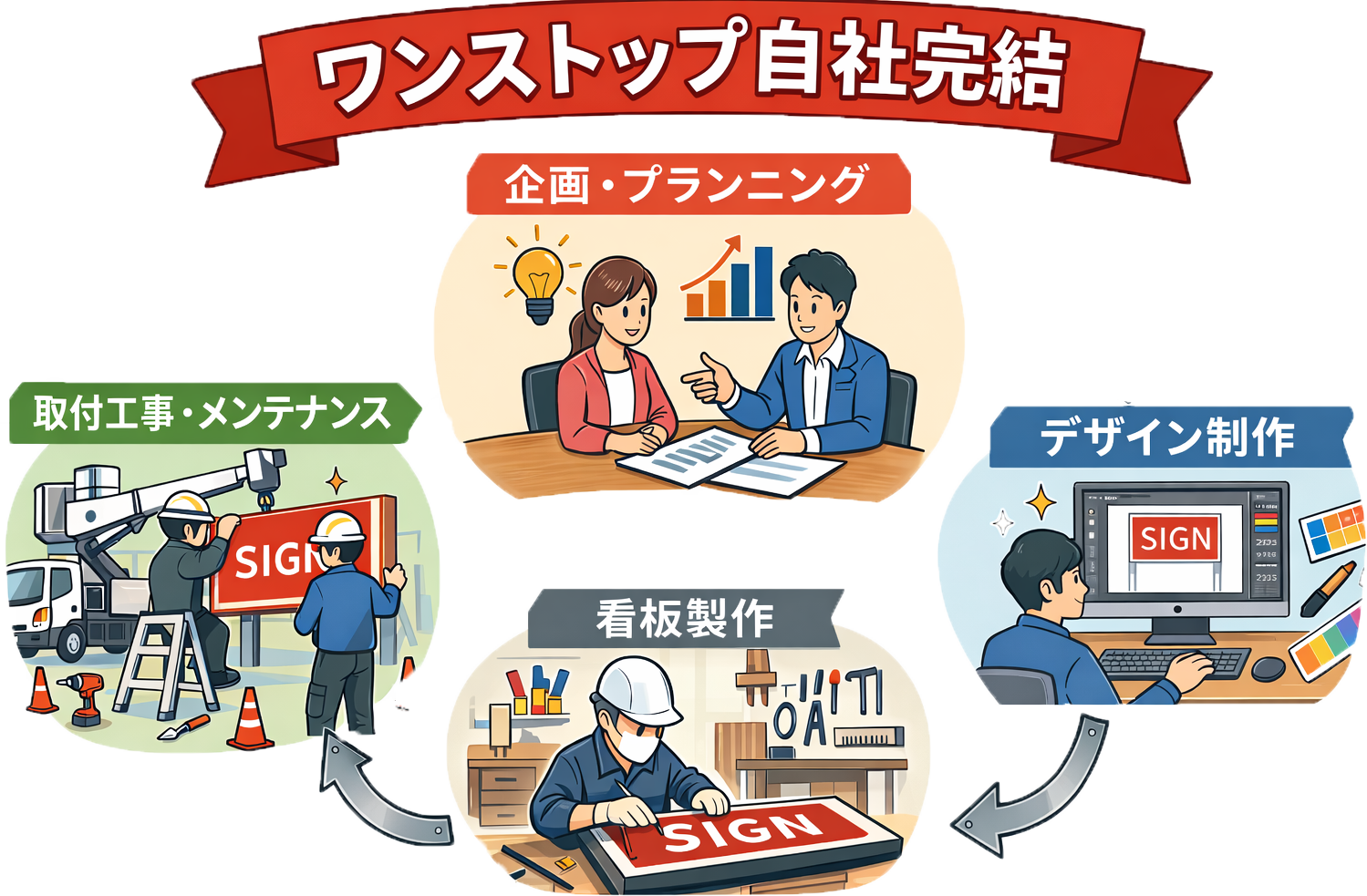 お客様の要望にいち早く対応し、短納期でも高品質な看板を製作。アフターフォローも迅速に対応し、看板の維持管理をサポート。